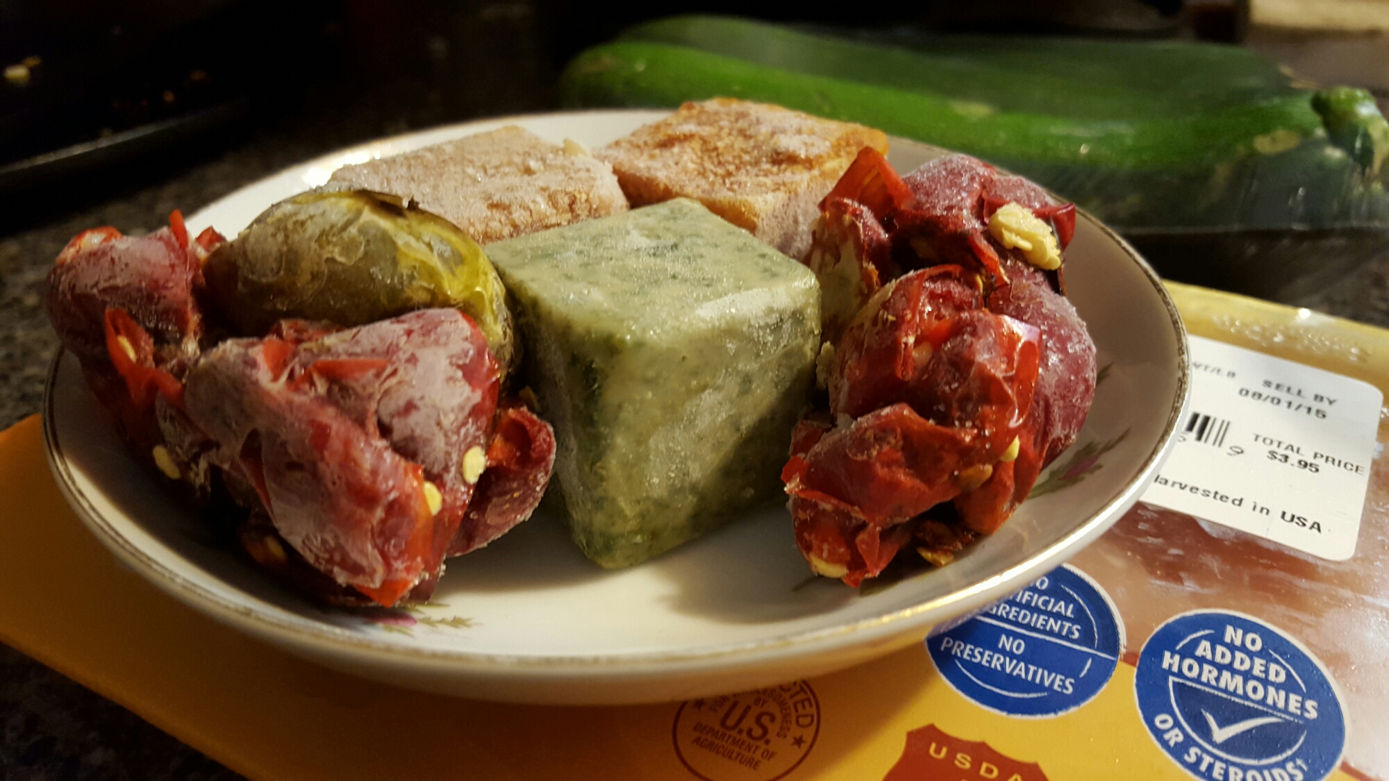 Did you get a bumper crop of herbs, or worse, purchase more than enough for your recipe? Whirl the remainder with some good quality fat using a blender or food processor, and freeze in cubes for easy seasoning later. Consider using homemade tomato sauce in the same way.