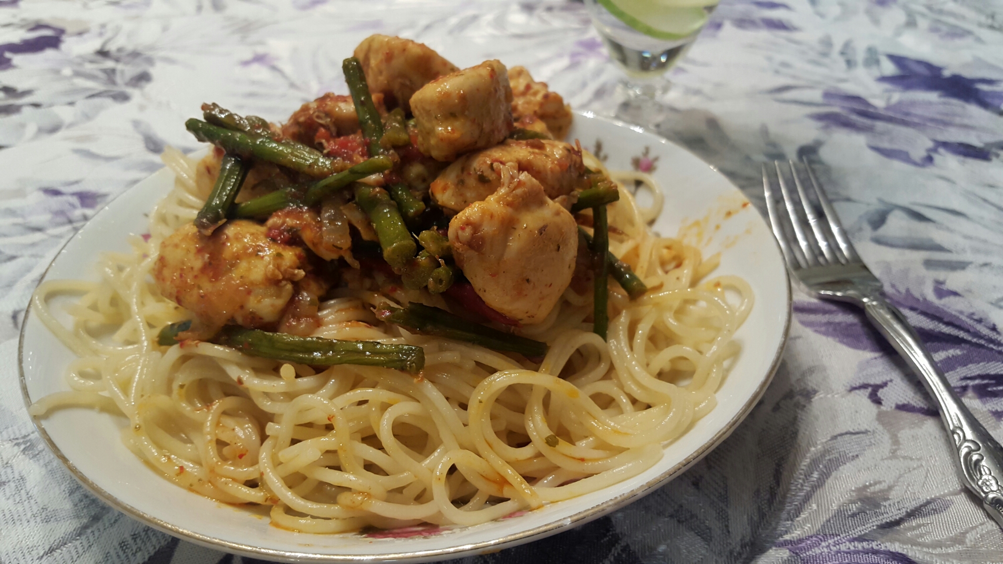 Saucy chicken chunks ( basil “cube” , tomato sauce “cubes”, asparagus stem ends and blistered cherry peppers from the freezer)